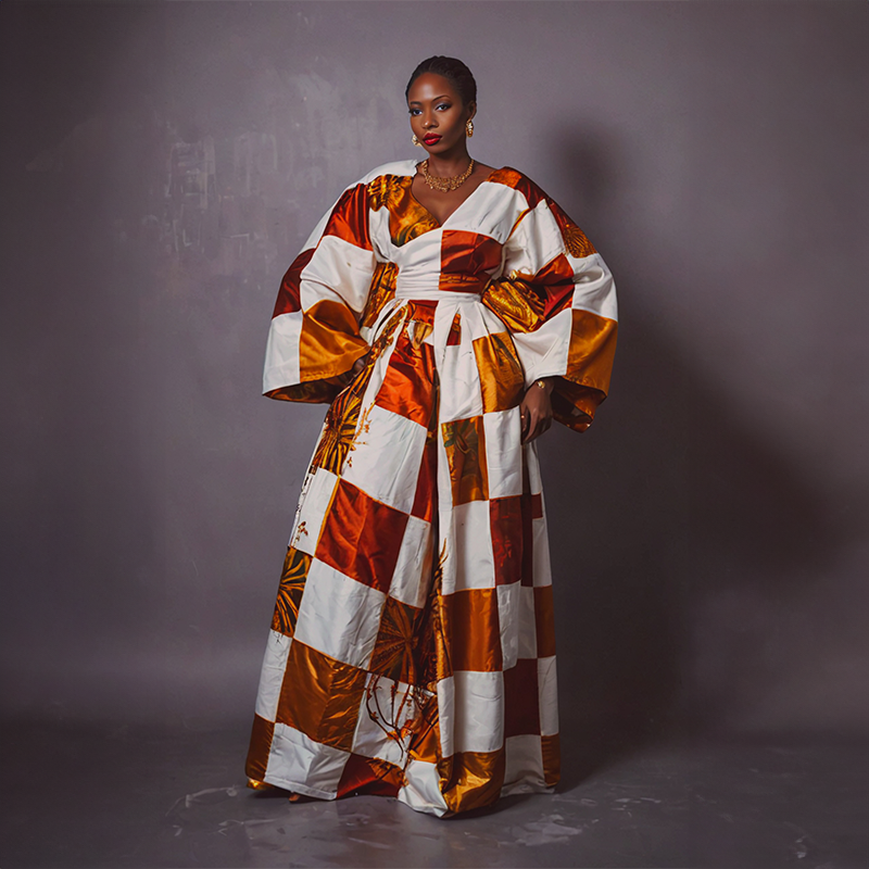 Cette robe somptueuse à carreaux est confectionnée à partir de tissu pagne tissé de haute qualité. Elle allie tradition et modernité avec son design unique et ses couleurs vibrantes. Les nuances de blanc, d’orange et de rouge se mélangent harmonieusement pour créer une pièce à la fois audacieuse et raffinée. Les manches amples et volumineuses ajoutent une touche de majesté à cette robe longue, parfaite pour les occasions spéciales.